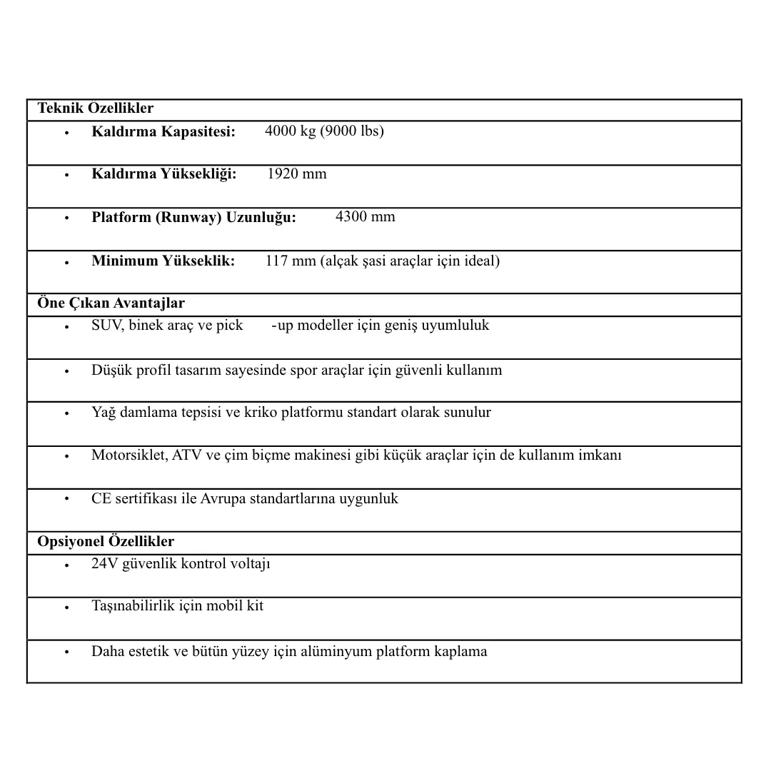 Yaklaşık 1.9 metre kaldırma yüksekliği ile alt park alanı oluşturarak dar alanlarda bile çift katlı park imkânı sunar. Hidrolik sistemi sayesinde sessiz, stabil ve güvenli bir çalışma sağlar. Manuel kontrol paneli ile lift hareketleri kolayca yönetilebilir.