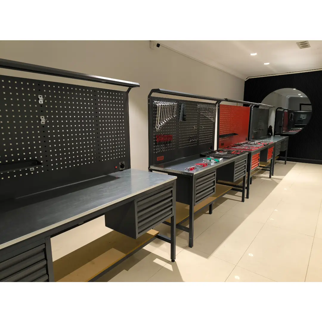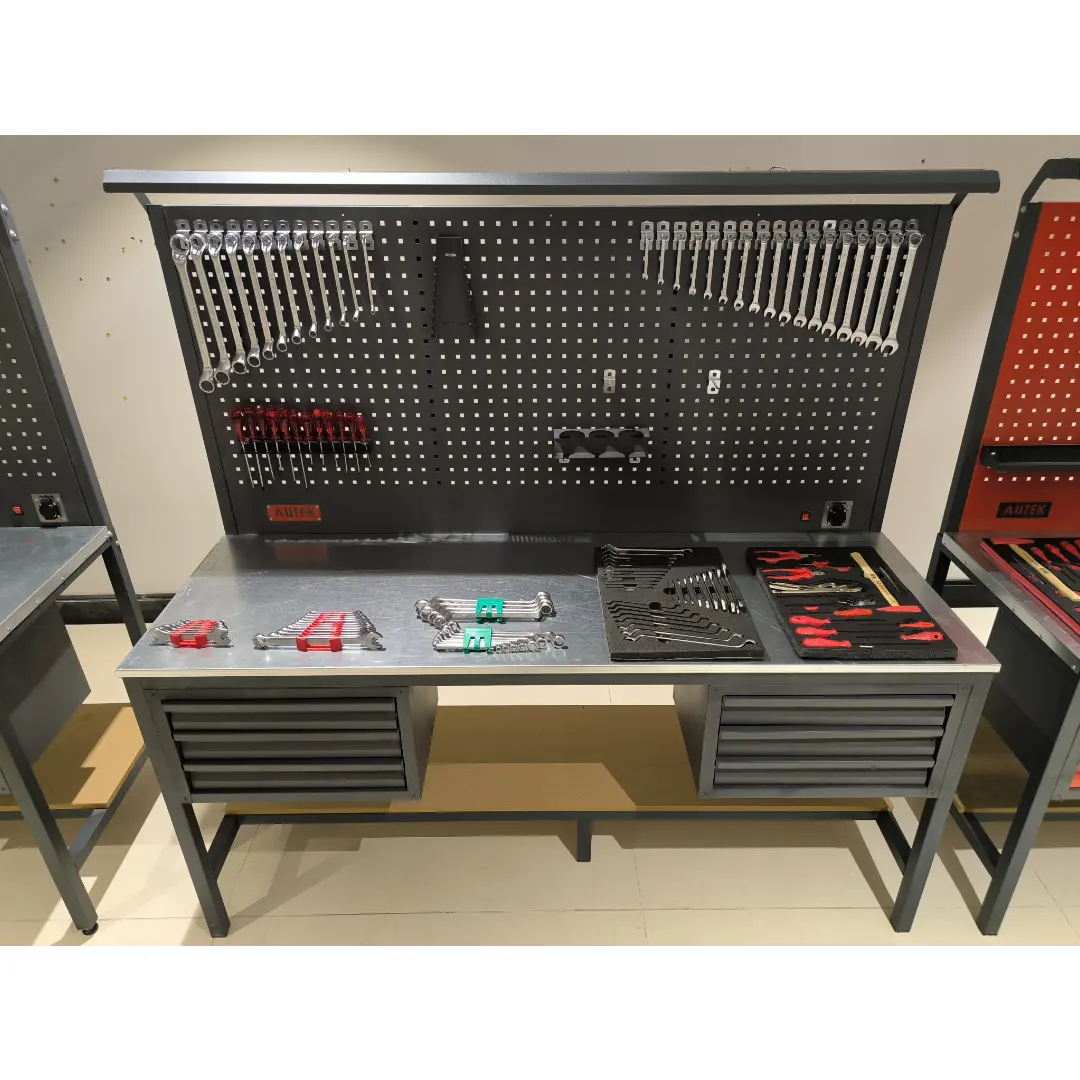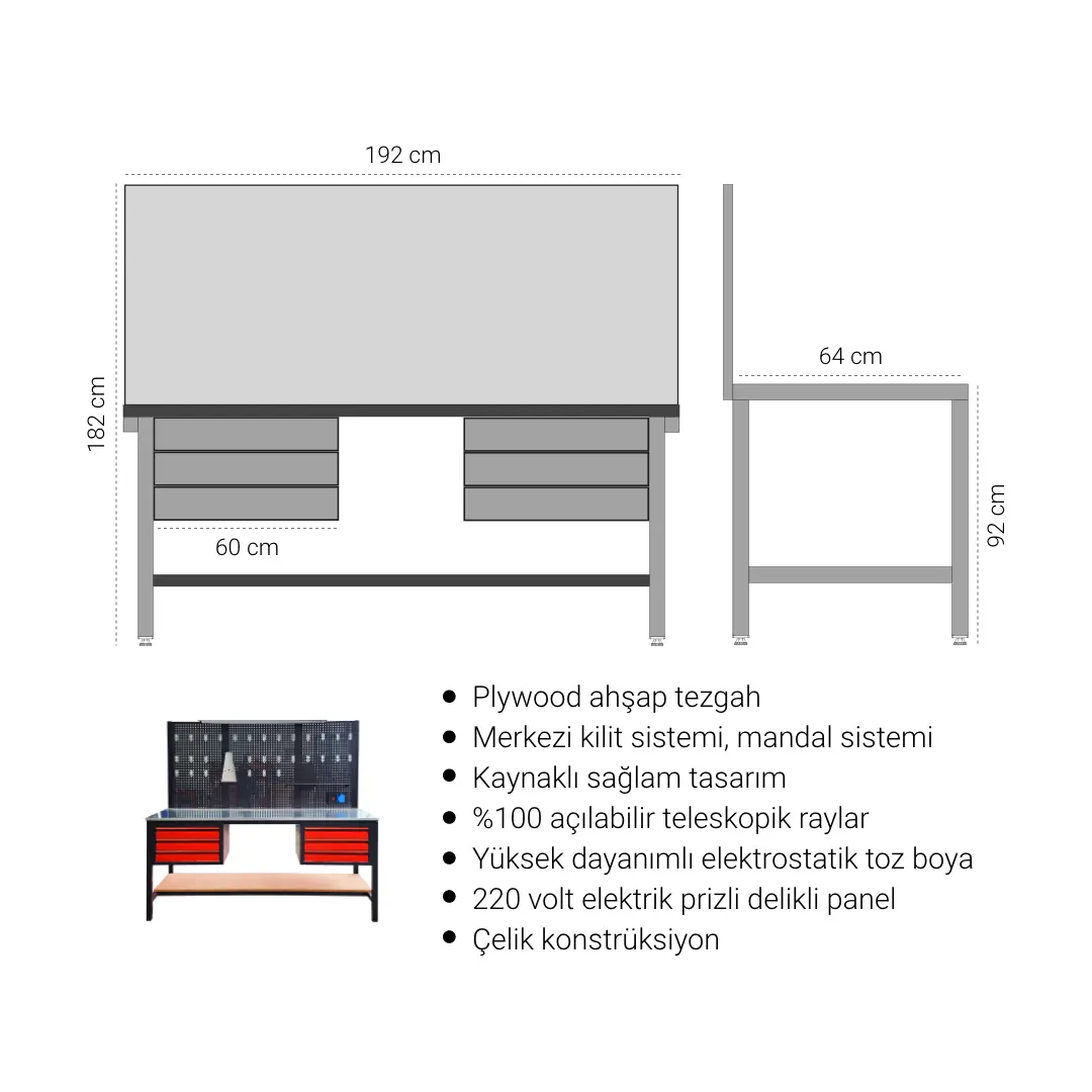 • Delikli panel (220 V prizli) – Alet asma ve elektrik ihtiyacı için pratik kullanım.